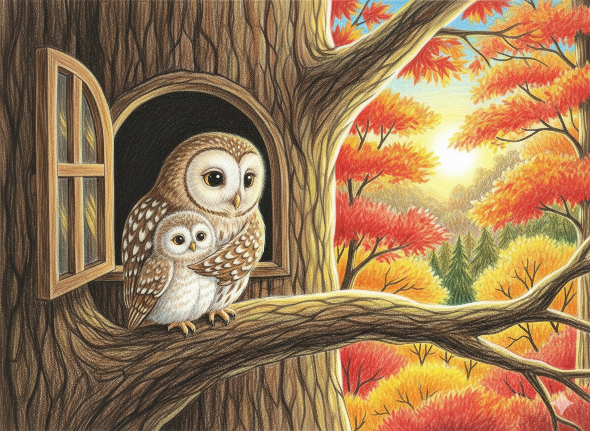 コロンのお家は、いちばんおおきなカシの木のてっぺん。お母さんとお父さんに、いつもぎゅーっと抱っこされて、**「ホーホー」**と静かな子守歌を聞きながら眠るのが大好きでした。