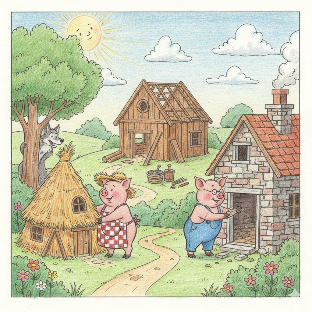 むかしむかし、ある緑豊かな森の入り口に、おかあさん豚と、三匹の元気な子豚の兄弟が暮らしていました。