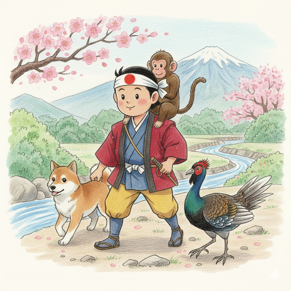 こうして、桃太郎は、犬、猿、キジという、三匹の頼もしい家来を連れて、鬼ヶ島を目指して進んでいきました。