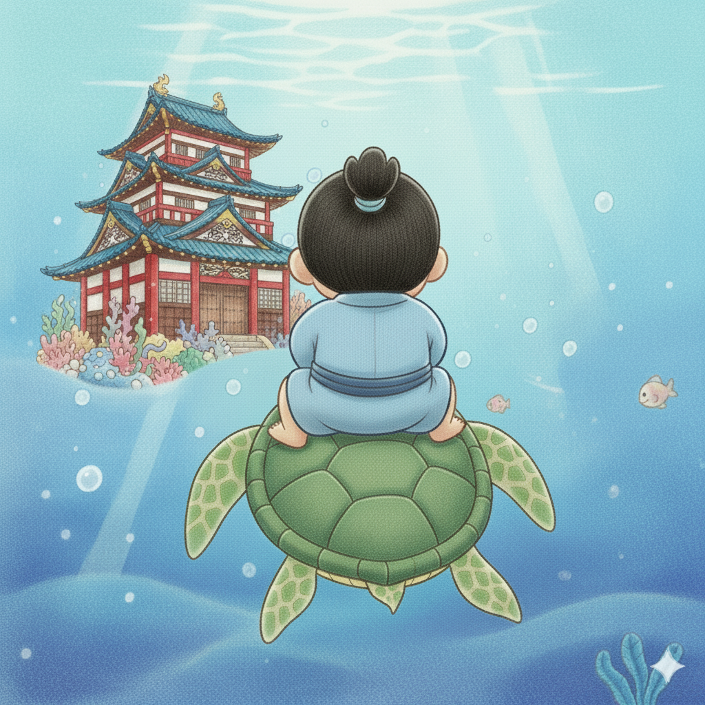 むかしむかし、海辺の村に、浦島太郎という、心優しい若者が住んでいました。浦島太郎は毎日、小さな舟で沖へ出て、魚を獲って暮らしていました。